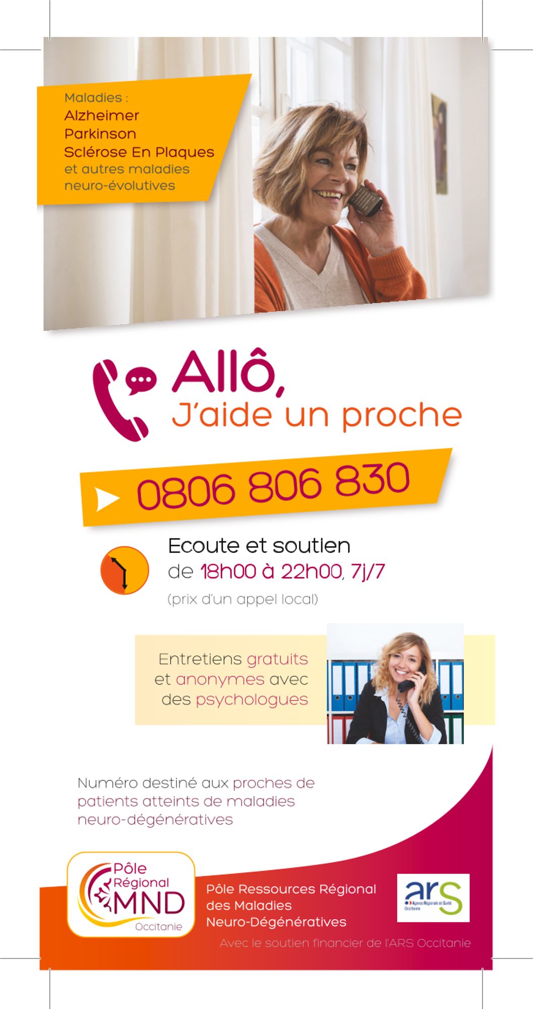 - Le Pôle MND coordonne le dispositif "Allô J'aide un proche", ligne téléphonique d'écoute et de soutien pour les aidants (voir plaquette téléchargeable en bas de page).