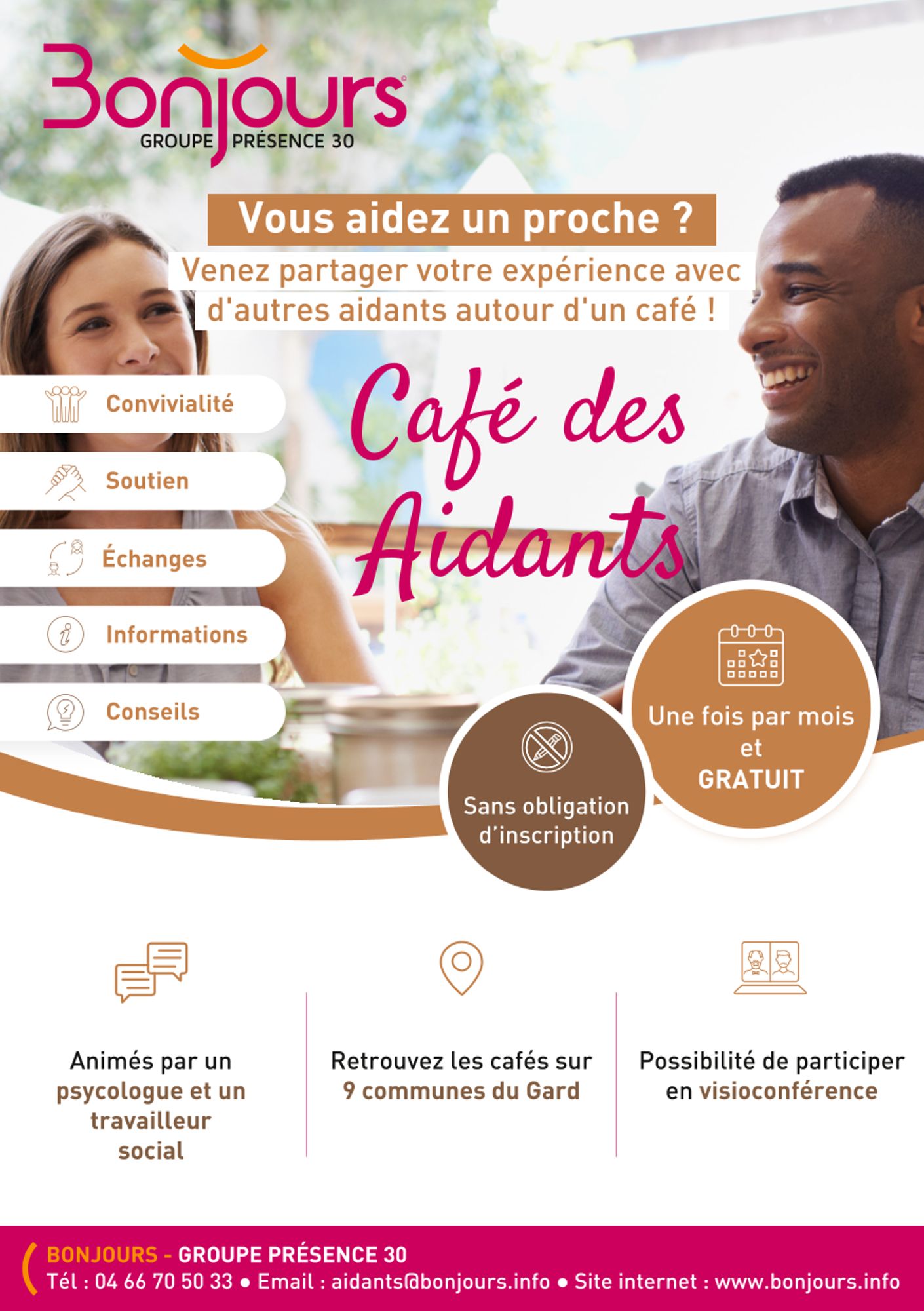 Le service d’aide à domicile Bonjours (Groupe Présence 30) vous propose le Café des aidants en pays viganais. Pour se rencontrer, échanger, s'informer, prendre une pause ... des rencontres tous les mois, en présentiel et en visioconférence, avec un psychologue et un travailleur social, et d'autres proches aidants !