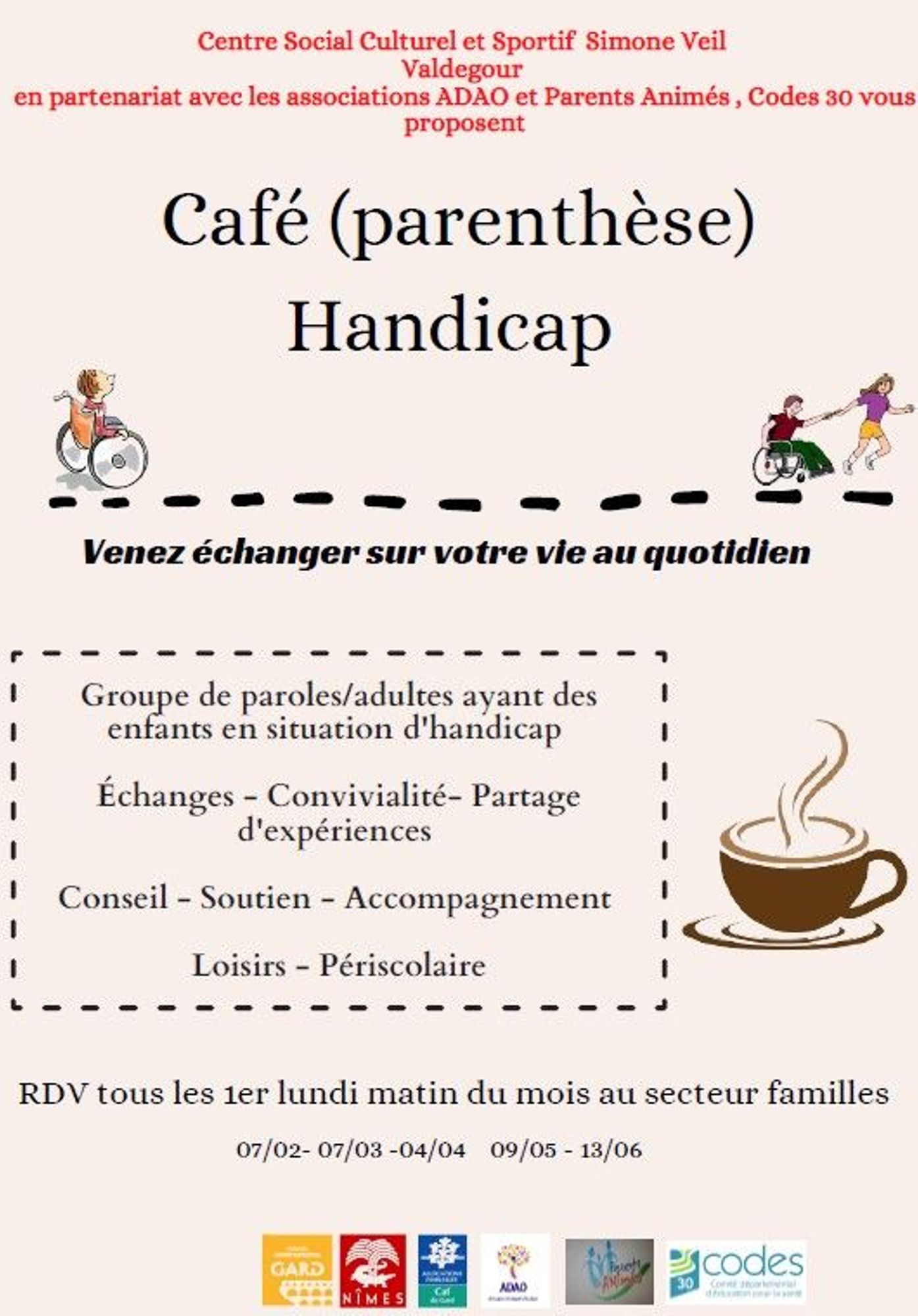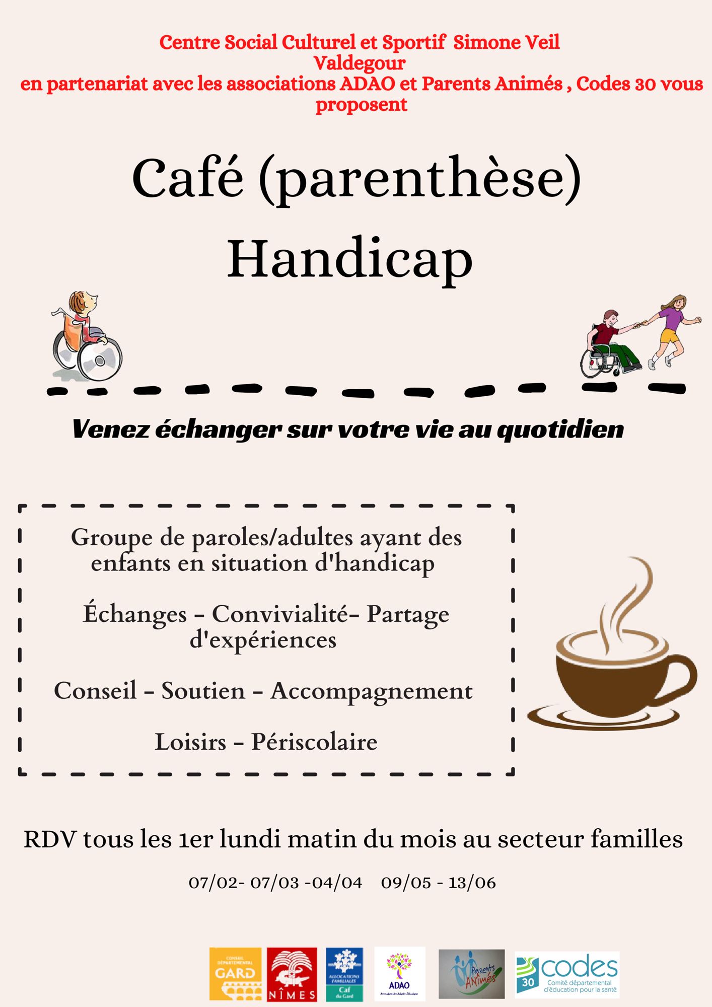 Le Centre Social Culturel et Sportif Simone Veil vous propose un temps d’échange tous les 1ers lundis matin du mois, en partenariat avec les associations ADAO et CODES 30. Nommé Café (parenthèse) Handicap, ce temps d’échange a été mis en place pour les personnes avec enfants en situation de handicap, suite à un constat auprès de la population d’une forte demande d’espace de rencontres et d’échanges.