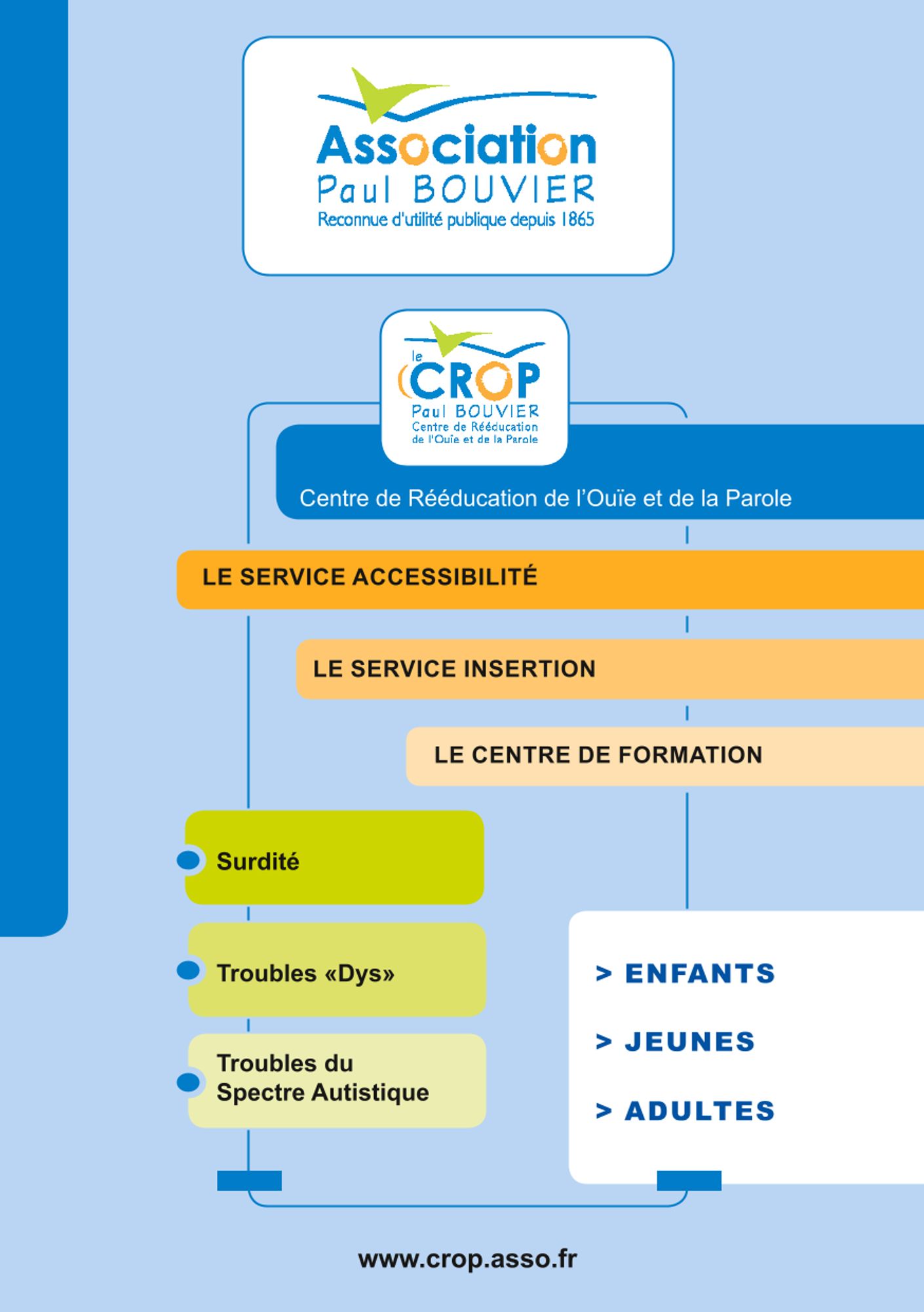 Le CROP Paul Bouvier accueille des jeunes de 0 à 20 ans porteurs de surdité ou de troubles spécifiques du langage, et des jeunes de 10 à 20 ans porteurs de troubles du spectre autistiques.