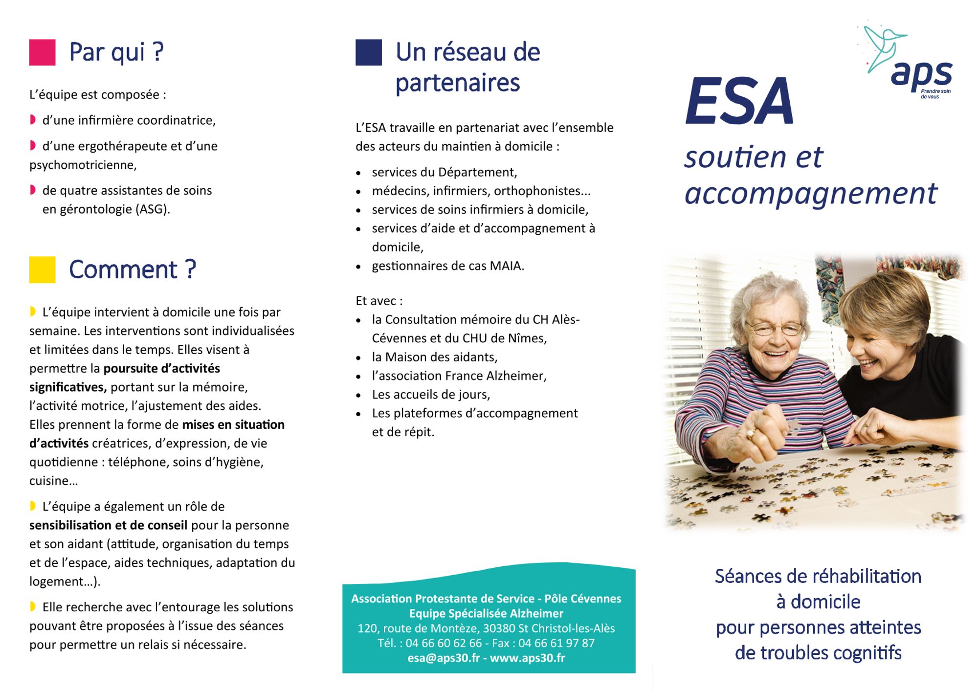 Infirmière coordinatrice : Anne GESSELLE, 04 66 60 50 11, esa@aps30.fr