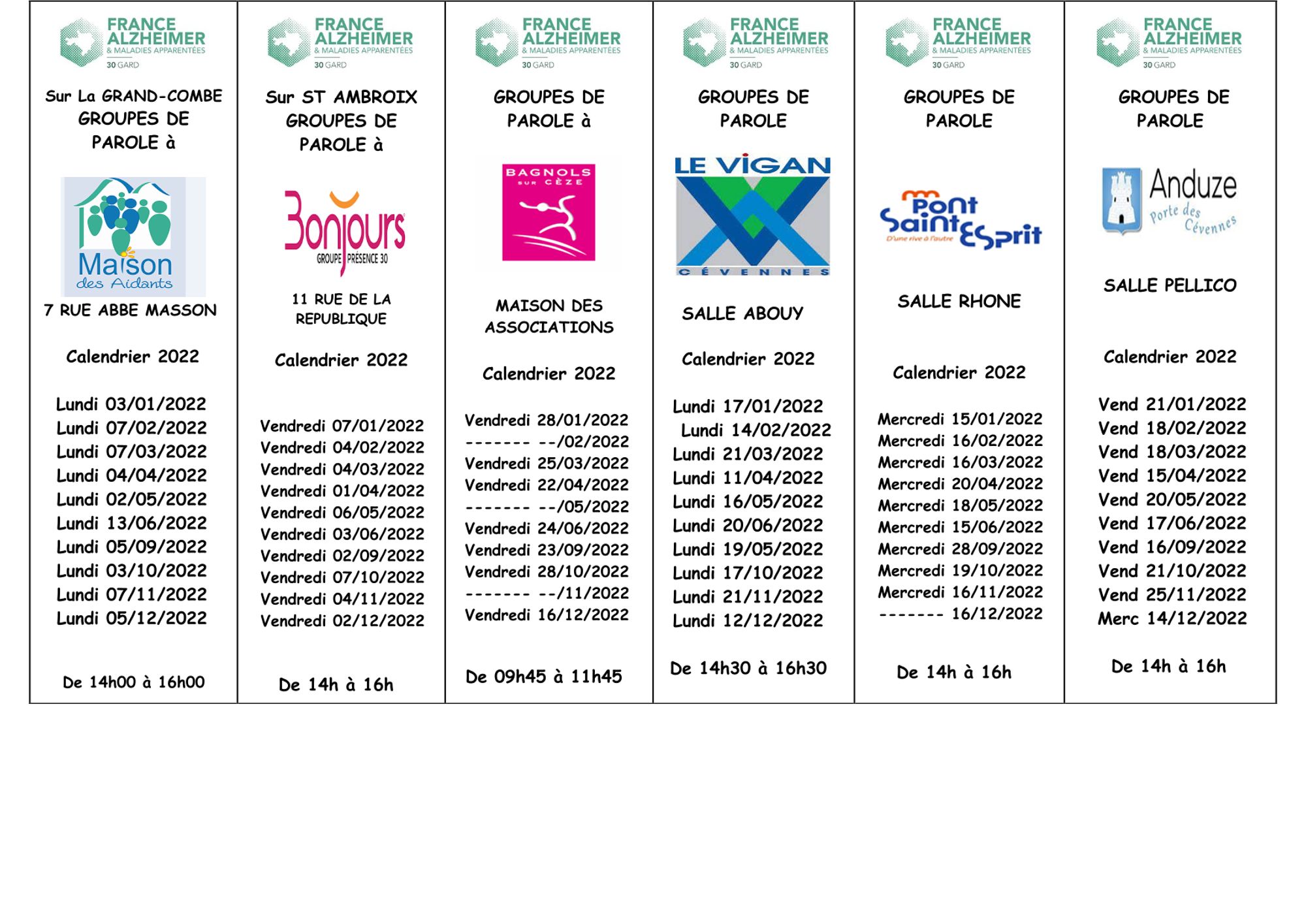 France Alzheimer Gard organise des groupes de paroles pour les proches aidants sur 16 communes du département du Gard : Alès, La Grand Combe, St Ambroix, Bagnols-sur-Cèze, Le Vigan, Pont St Esprit, Anduze, Beaucaire, Nîmes, Uzès, Marguerites, Aimargues, Vauvert, Parignargue, Grau du Roi, Aubais.
