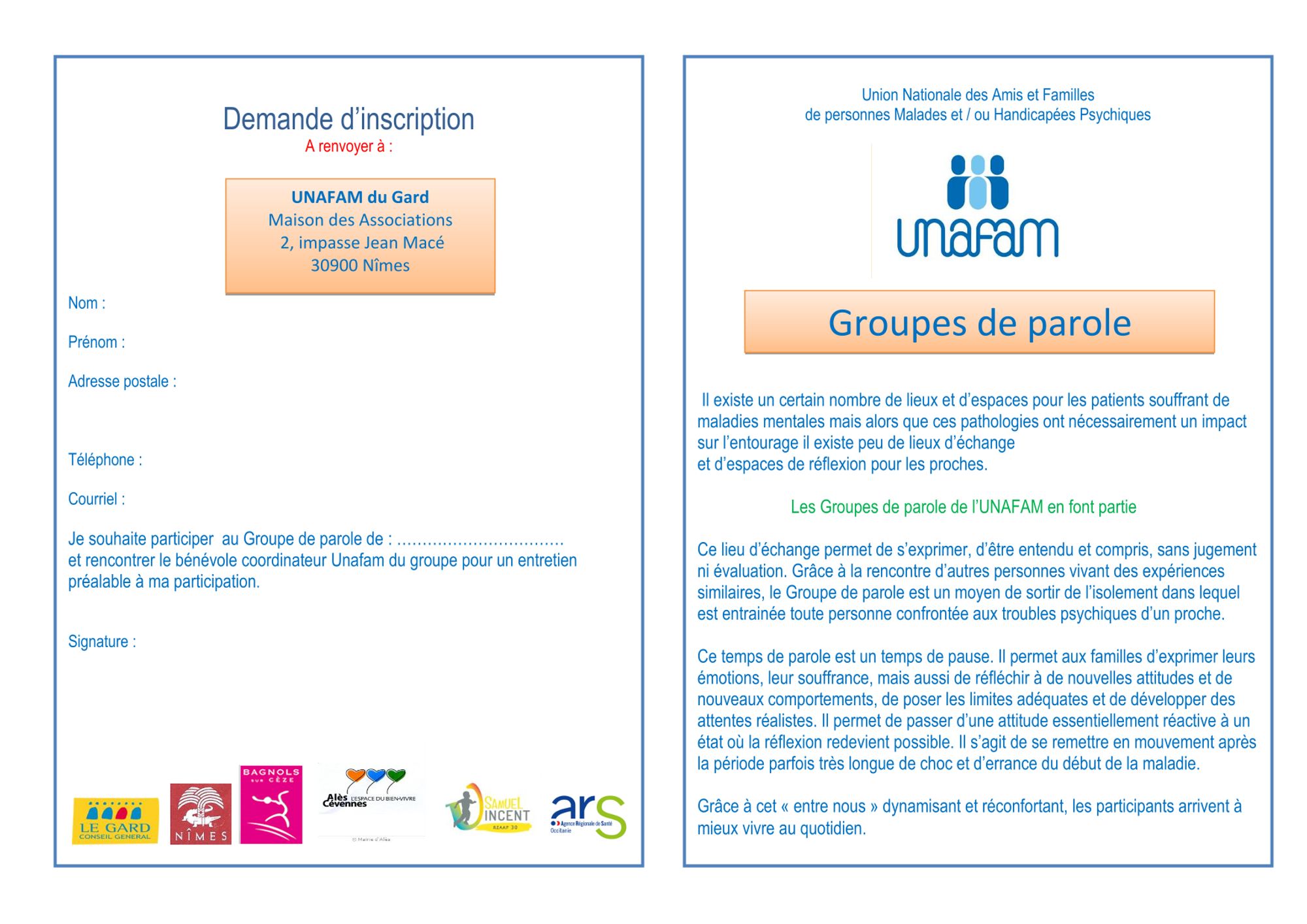 L'UNAFAM Gard, la délégation gardoise de l'Union Nationale de Familles et Amis de personnes Malades et/ou handicapées psychique, vous propose un groupe de parole sur Nîmes et Alès.