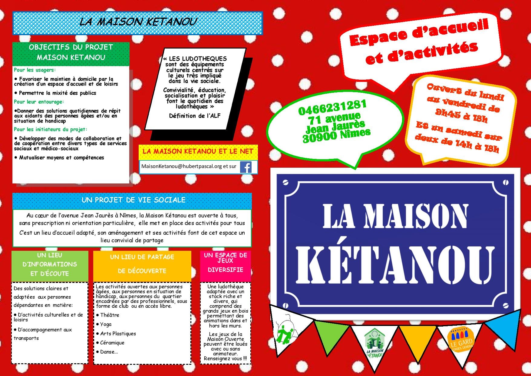 La Maison Ketanou (anciennement la Maison Ouverte), a ouvert ses portes en 2012 quartier Cadereau. Vous pouvez participer à des ateliers (art-plastique, danse, gymnastique doue, yoga, musique ...) ou simplement venir y boire votre café, passer un moment ...