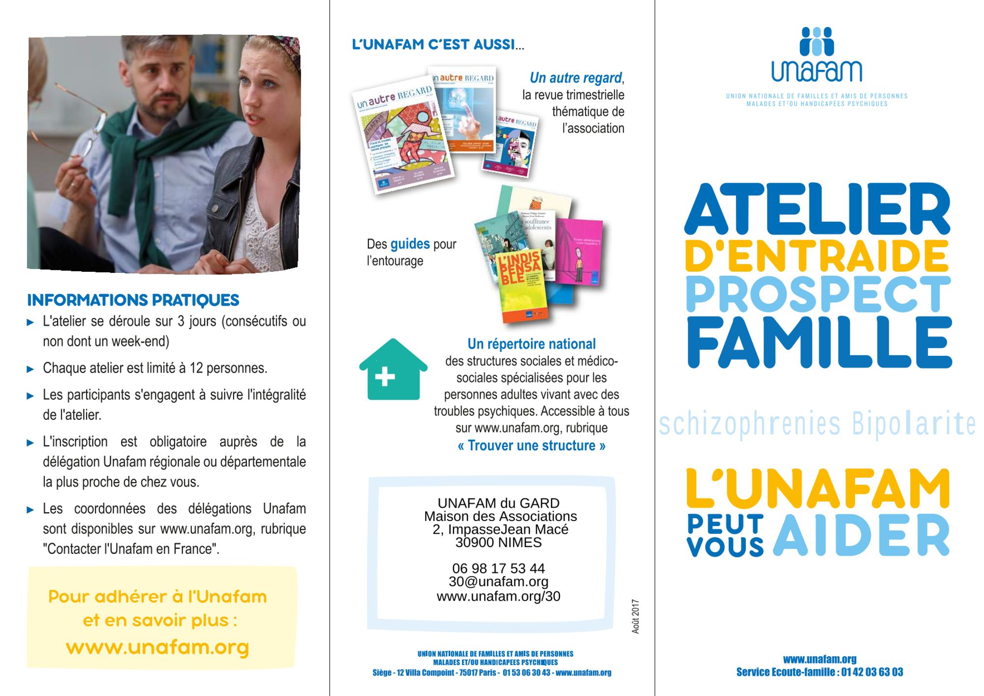 L'UNAFAM Gard, la délégation gardoise de l'Union Nationale de Familles et Amis de personnes Malades et/ou handicapées psychique, vous propose des ateliers animés par des proches aidants bénévoles à l'UNAFAM Gard : les ateliers d'entraide PROSPECT.