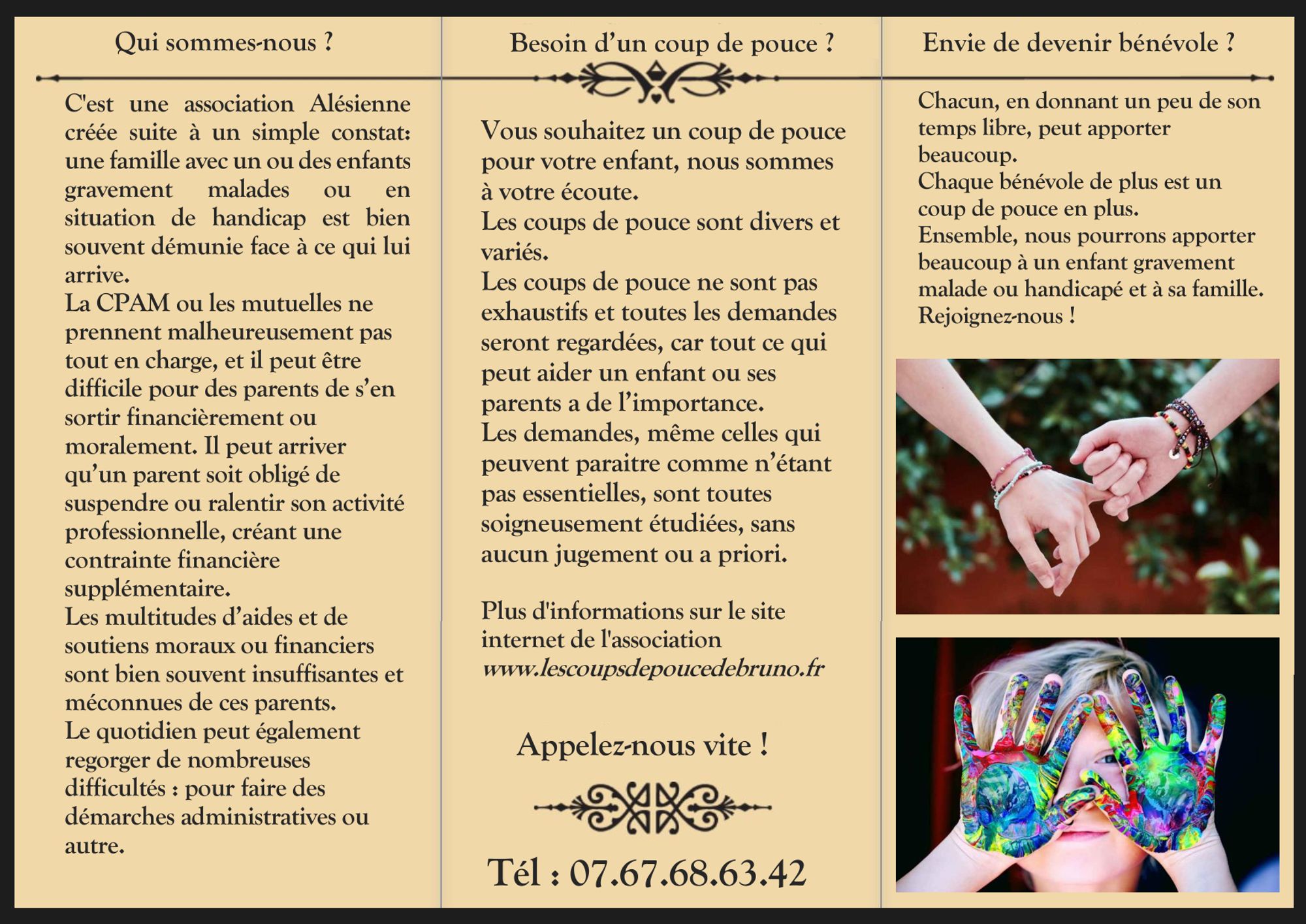 L'association Les Coups de Pouce de Bruno est une association créée il y a quelques années pour venir en aide aux enfants en situation de handicap et/ou gravement malades (moins de 18 ans), et leurs familles.