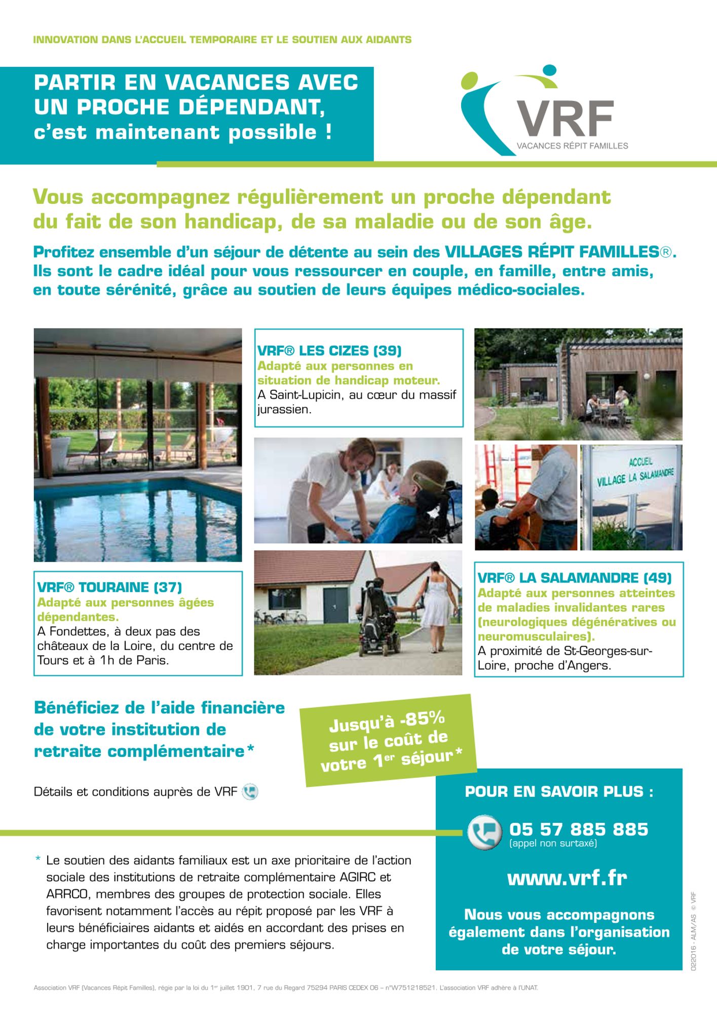 Vacances Répit Famille (VRF) propose des séjours vacances aidant-aidé. Le proche et son aidant peuvent profiter d'un séjour ensemble tout en bénéficiant d'un accompagnement personnalisé (activités, accompagnement médico-social ...).