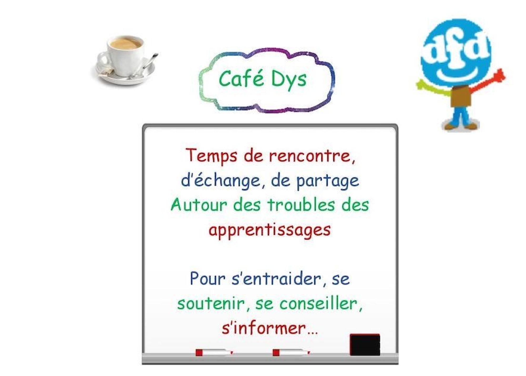 Le Café Dys a lieu une fois par mois. Pour connaître les prochaines dates, veuillez vous rapprocher de la DFD 30.