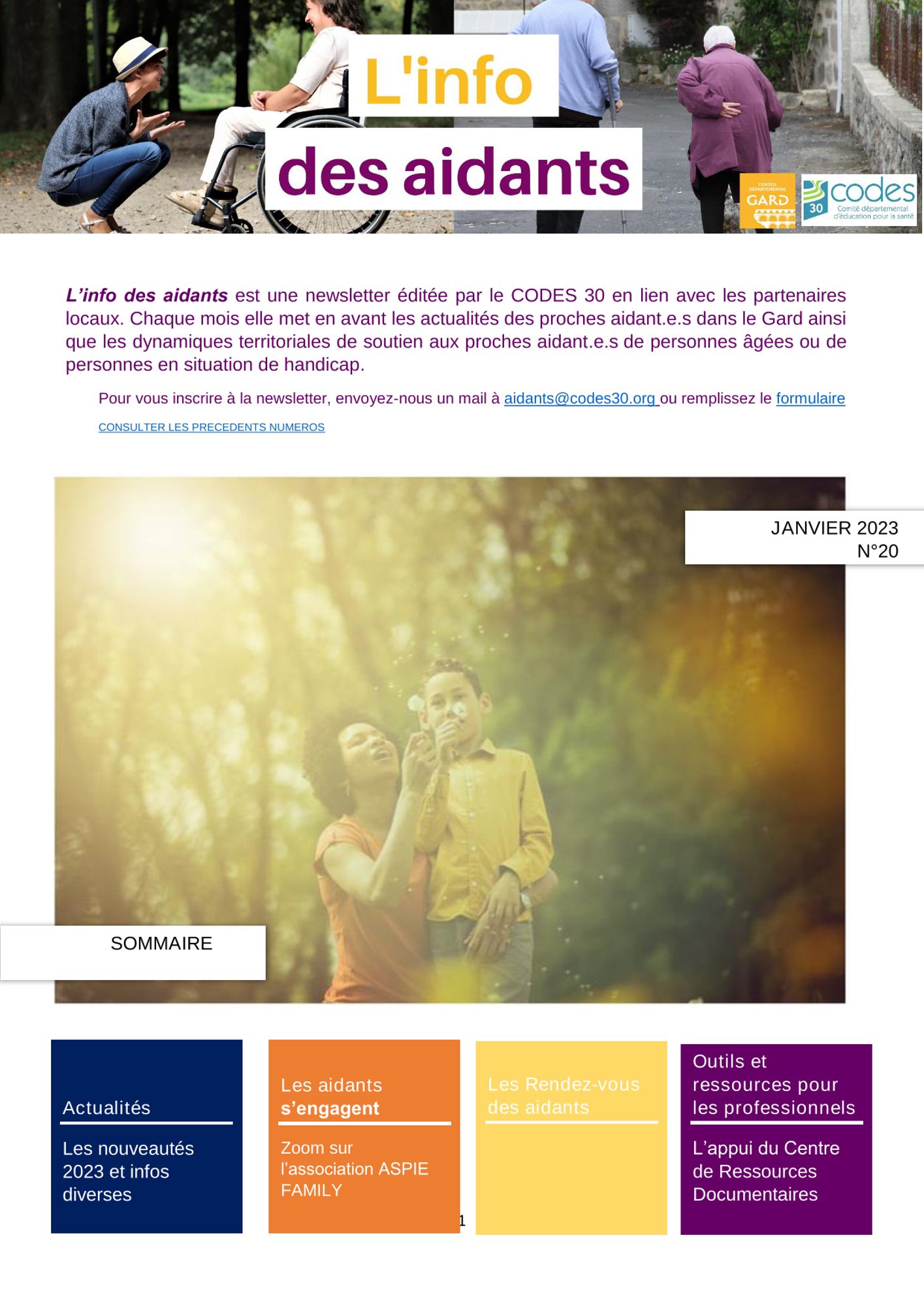 L'info des Aidants se réorganise ! Elle sortira en fin de chaque mois et nous vous proposerons maintenant de vous informer des rendez-vous prévus le mois suivant. Vous trouverez alors dans ce dernier numéro, les rendez-vous du mois de Février.