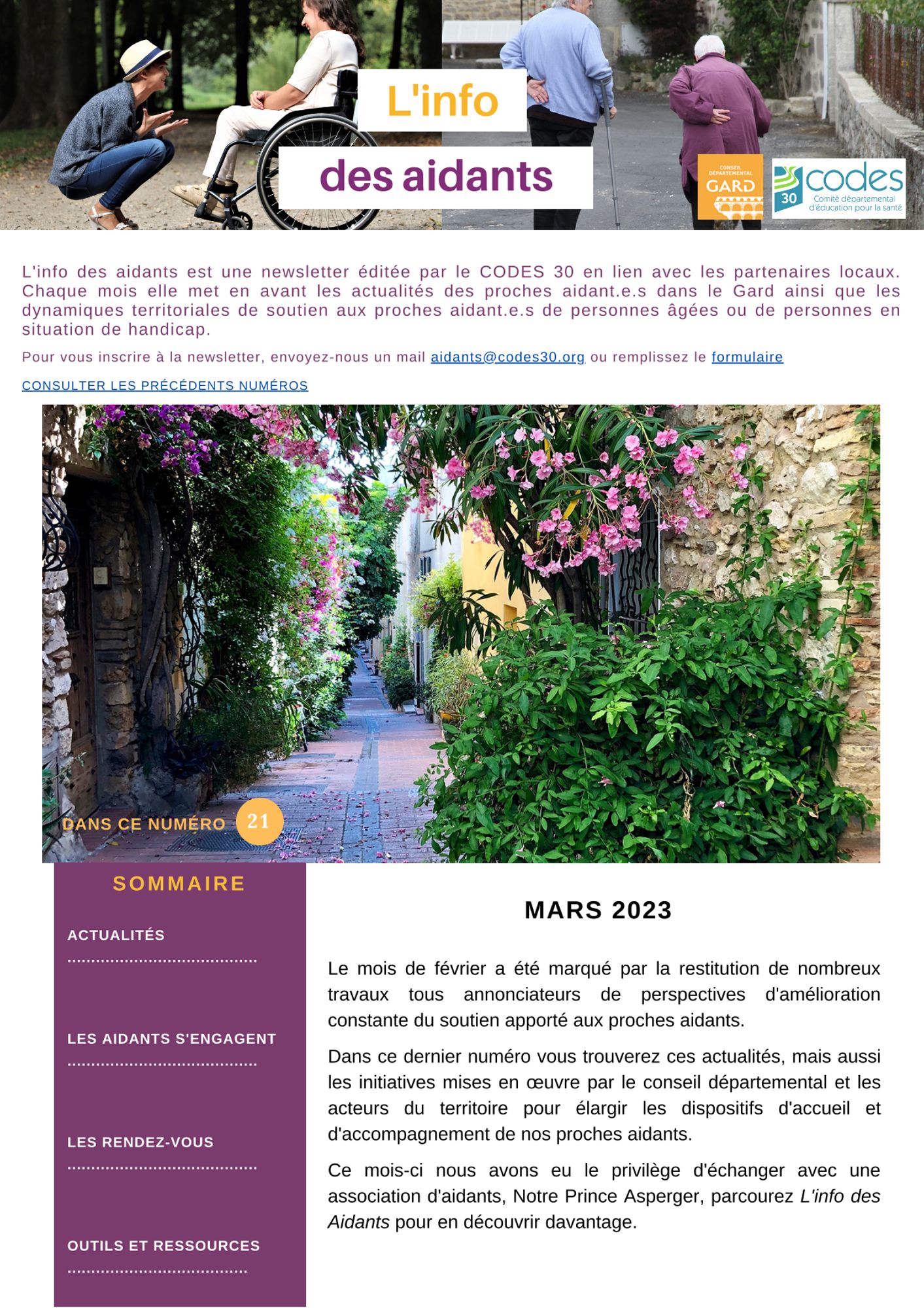 Retrouvez le numéro de L'info des aidants du mois de mars 2023, newsletter dédiée à l’actualité des proches aidants dans le Gard, aux dynamiques territoriales de soutien aux aidants et à leurs partenaires.