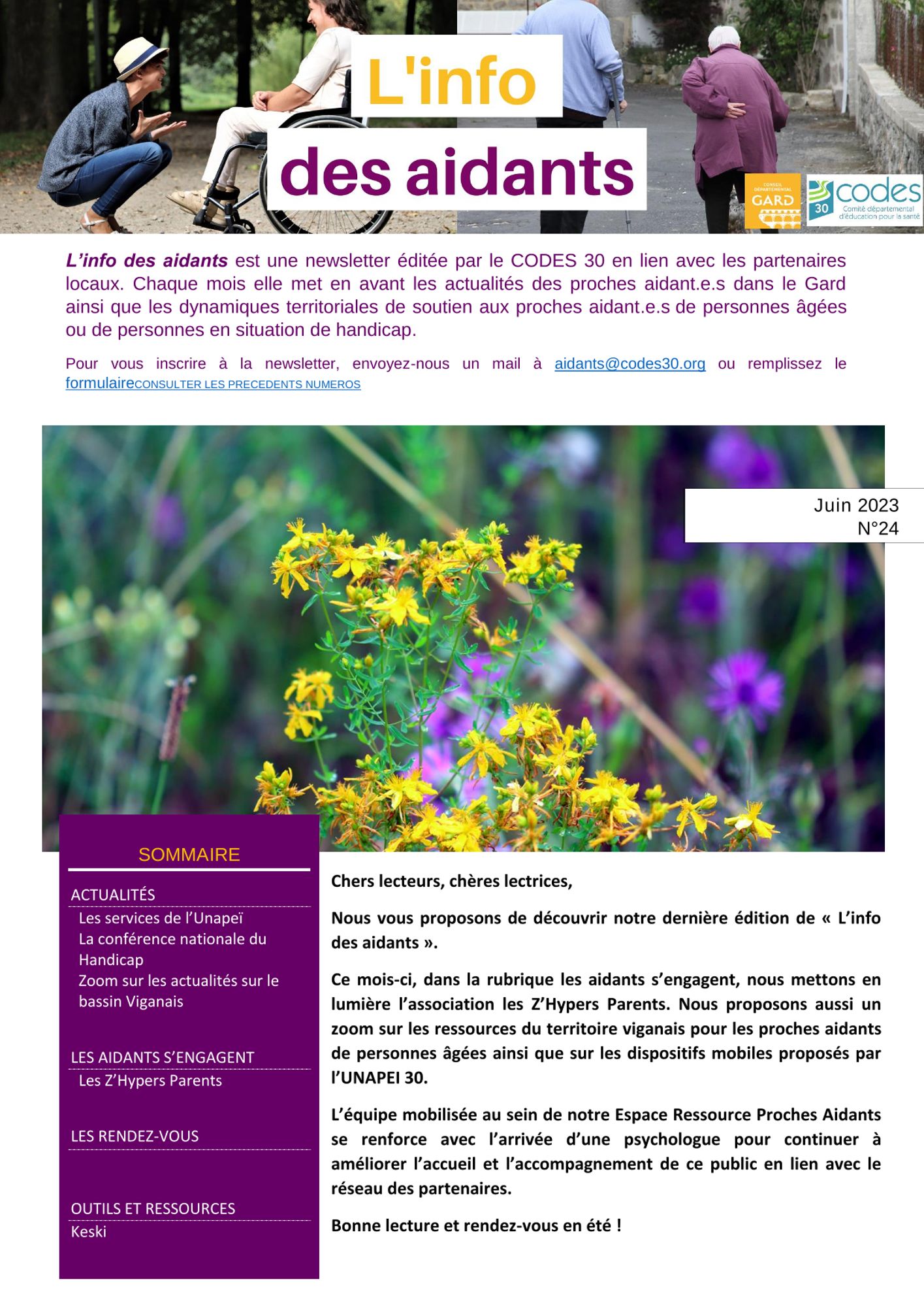 Retrouvez le numéro de L'info des aidants du mois de juin 2023, newsletter dédiée à l’actualité des proches aidants dans le Gard, aux dynamiques territoriales de soutien aux aidants et à leurs partenaires.