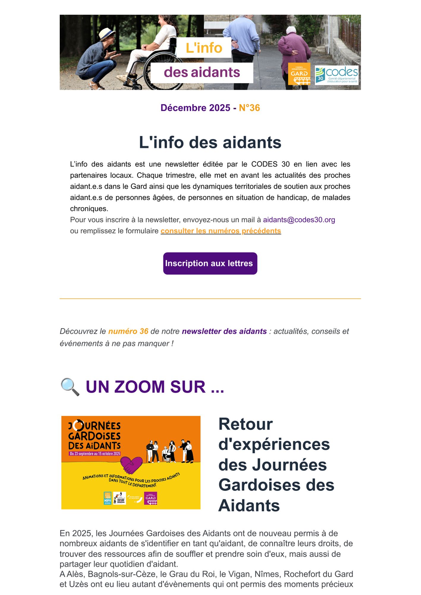 Retrouvez notre dernière édition de L'info des aidants, newsletter dédiée à l’actualité des proches aidants dans le Gard, aux dynamiques territoriales de soutien aux aidants et à leurs partenaires.