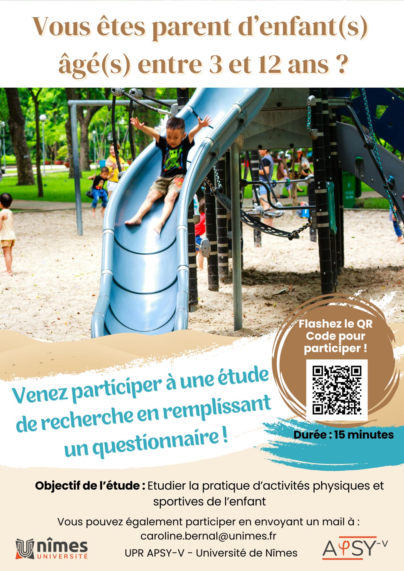 Une étude est destinée aux parents d'enfants âgés de 3 à 12 ans et consiste à répondre à un questionnaire d'une durée de 15 minutes maximum ; il n'y a aucune condition particulière pour participer, tout parent peut répondre.