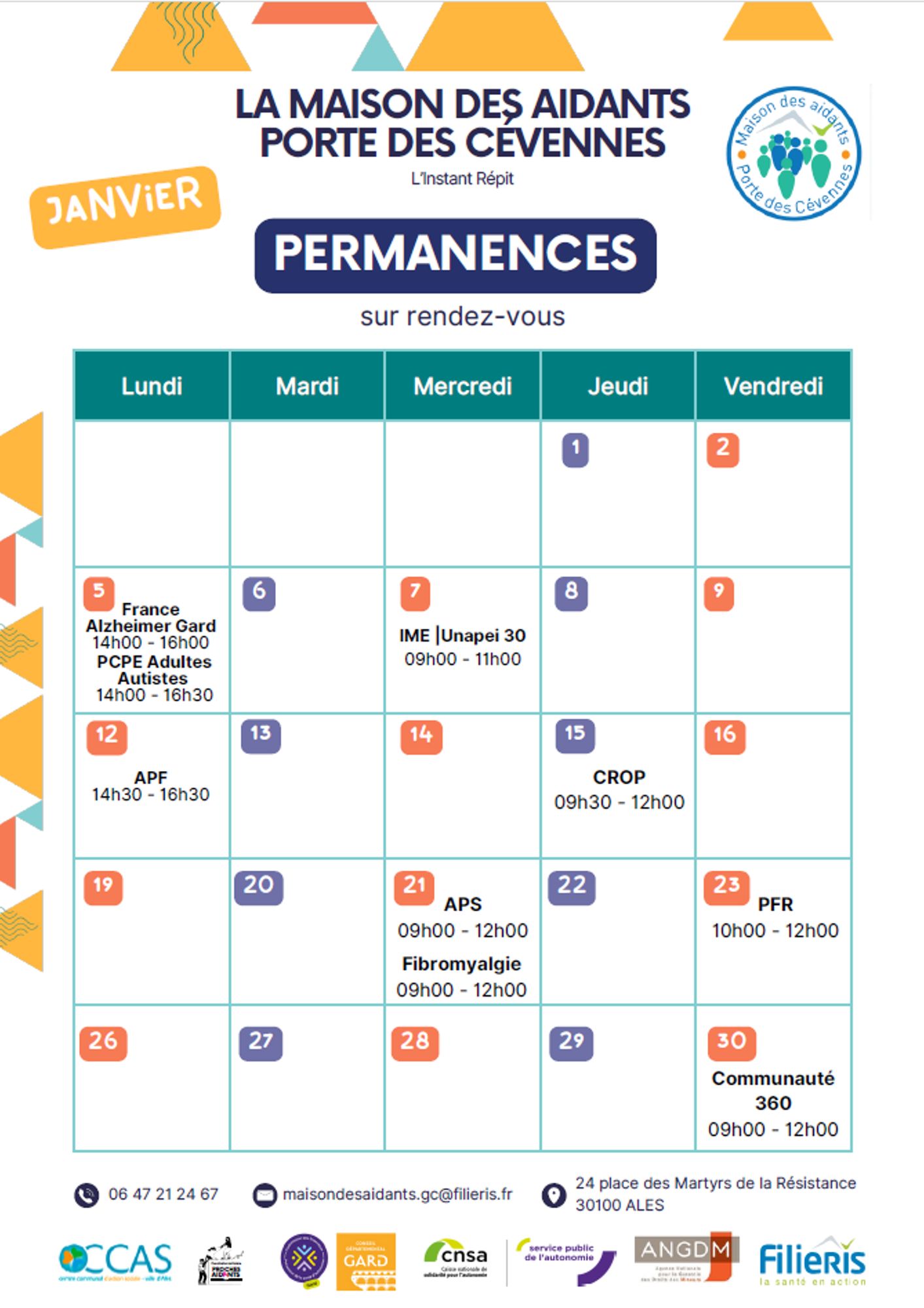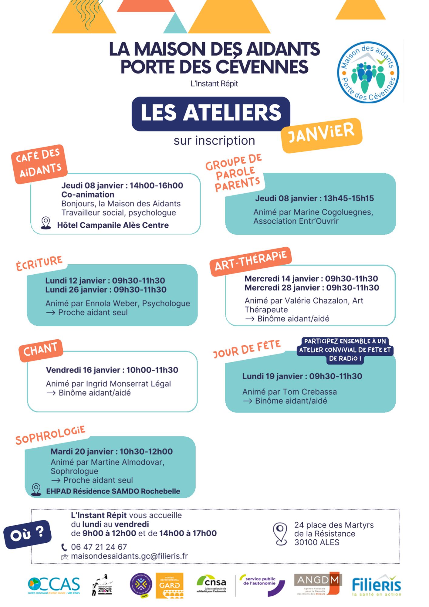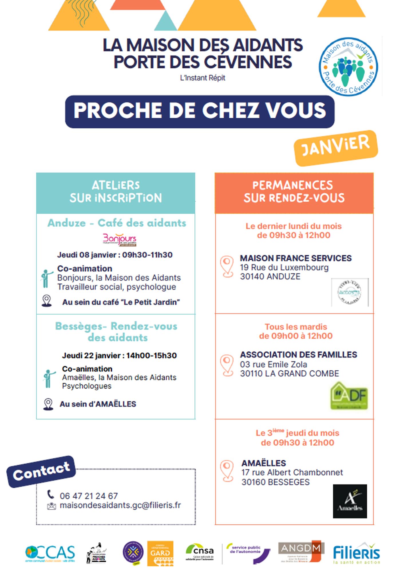 Programme de la Maison des aidants Programme de Janvier Informations et inscriptions Maison des aidants Tél. : 06 47 21 24 67 Mail : maisondesaidants.gc@filieris.fr Télécharger le programme de la Maison des Aidants et les permanences des partenaires (1.5 Mo)